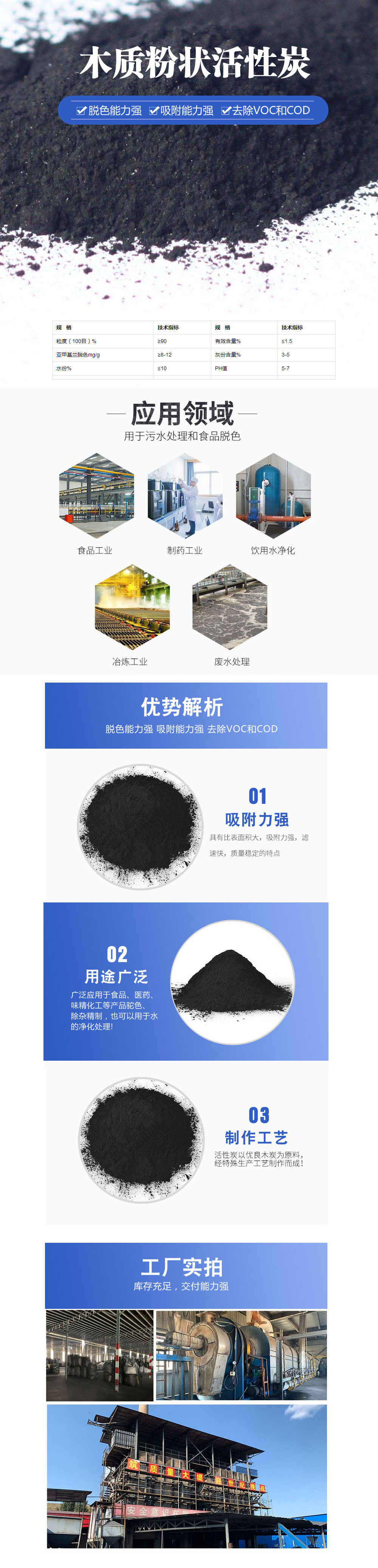 粉末活性炭以優(yōu)質(zhì)木屑、椰殼、煤質(zhì)為原料,經(jīng)系列生產(chǎn)工藝精加工而成。外觀呈黑色粉末或是微顆粒,產(chǎn)品廣泛應(yīng)用于食品、飲料、醫(yī)藥、自來水、糖、油脂等行業(yè),在釀酒、污水處理、電廠、垃圾焚燒、電鍍等領(lǐng)域應(yīng)用也較為普遍。 粉狀活性炭的脫色率達76%,粉狀活性炭又被稱為粉末活性炭,按其材質(zhì)可分為煤質(zhì)粉狀活性炭、木質(zhì)粉